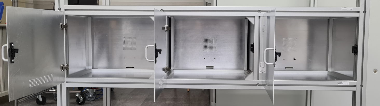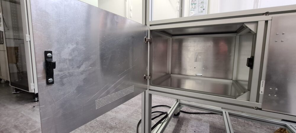 La chambre est composée de plaques en aluminium servant de cloisons, insérées dans des cadres en aluminium. L’étanchéité est assurée par un joint EMC et une fermeture adéquate, tandis que la ventilation est maintenue par des trous percés précisément mesurés, comme décrit ci-dessous.