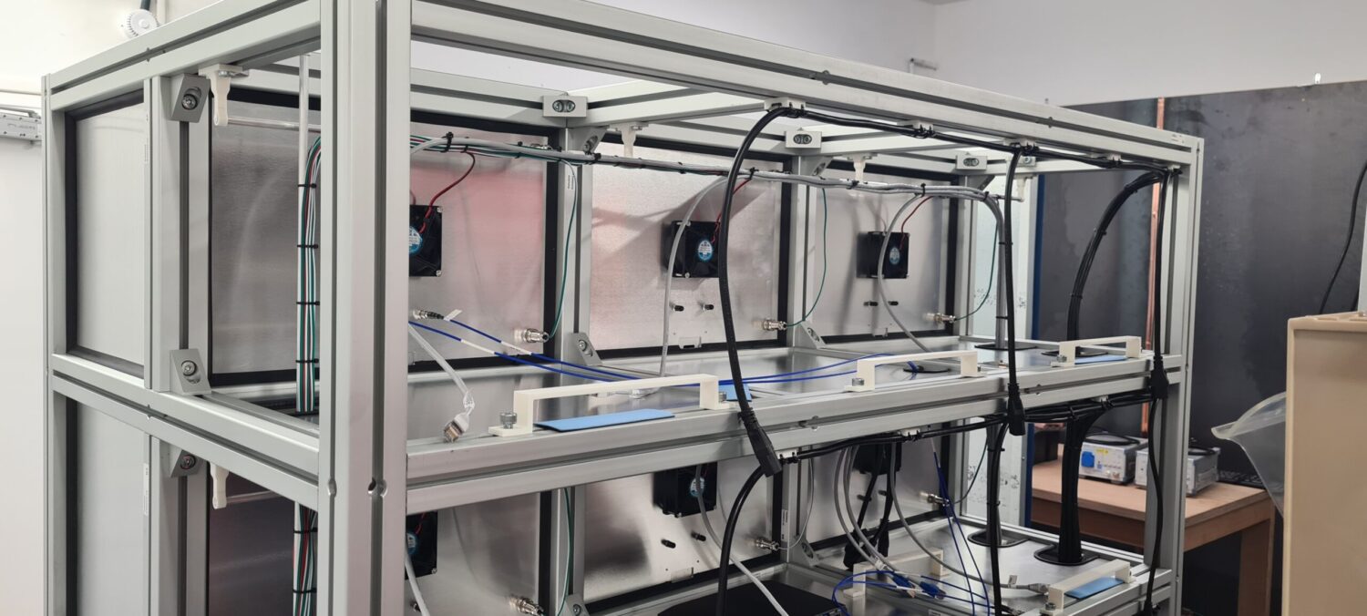 Pour la Construction de 12 mini chambres, j’ai conçu un rack dimensionné pour contenir l’ensemble en un seul bloc destiné à des tests RF en conduits, c’est à dire connecté par cable ou guide d’ondes.